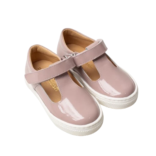 נעלי ילדות בצבע ורוד מבריק. לנעליים יש רצועה אחת רחבה העשויה מחומר דמוי עור הנסגרת באמצעות סקוץ' מעל החלק העליון של הנעל. הנעליים פתוחות במרכז עם חתך אנכי, המעניק מראה קליל ומאוורר. הסוליות לבנות ועבות, עשויות מגומי המבטיח יציבות ונוחות להליכה. החלק הפנימי של הנעל מרופד בחומר עור בצבע חום בהיר. הנעליים מעוצבות בסגנון קלאסי-אלגנטי, המתאים לשימוש יומיומי וגם לאירועים מיוחדים.