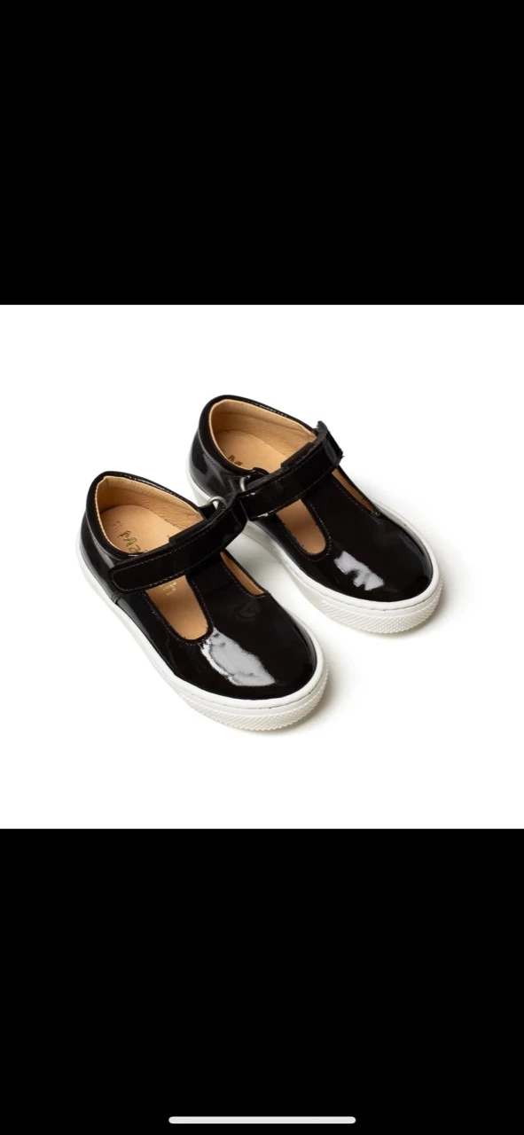 נעלי ילדות בצבע ורוד מבריק. לנעליים יש רצועה אחת רחבה העשויה מחומר דמוי עור הנסגרת באמצעות סקוץ' מעל החלק העליון של הנעל. הנעליים פתוחות במרכז עם חתך אנכי, המעניק מראה קליל ומאוורר. הסוליות לבנות ועבות, עשויות מגומי המבטיח יציבות ונוחות להליכה. החלק הפנימי של הנעל מרופד בחומר עור בצבע חום בהיר. הנעליים מעוצבות בסגנון קלאסי-אלגנטי, המתאים לשימוש יומיומי וגם לאירועים מיוחדים.