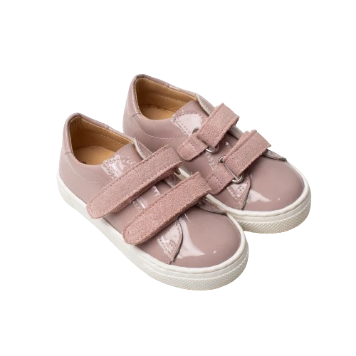 נעלי ילדים בצבע ורוד מבריק. הנעליים בעלות שתי רצועות סקוץ' המיועדות לנעילה והסרה קלה. רצועות הסקוץ' עשויות מחומר דמוי זמש, המעניק להן מראה ייחודי ומרקם שונה מהנעל עצמה. הסוליות הלבנות והעבות מגומי מספקות נוחות ויציבות. החלק הפנימי של הנעל מרופד בחומר מעור בצבע חום בהיר. הנעליים מעוצבות בסגנון ספורטיבי-אלגנטי, המתאים גם לשימוש יומיומי וגם לאירועים מיוחדים.